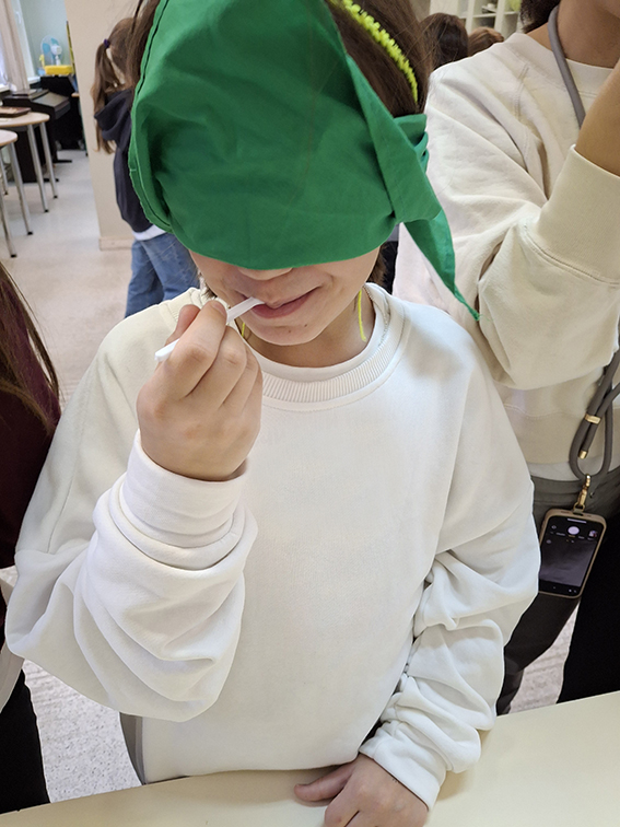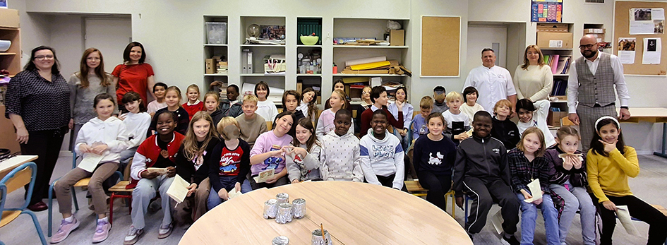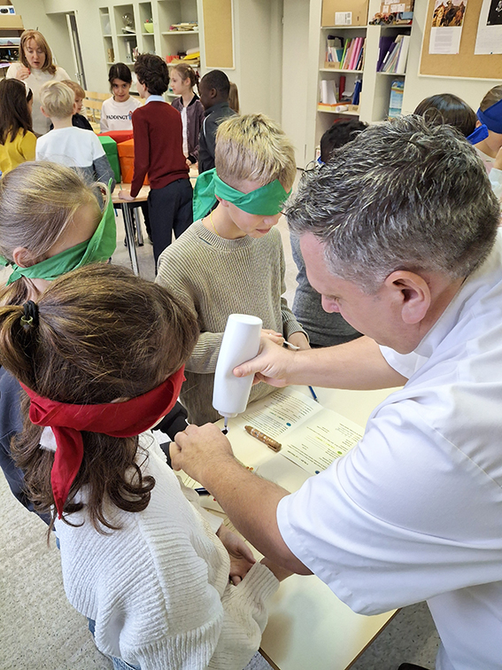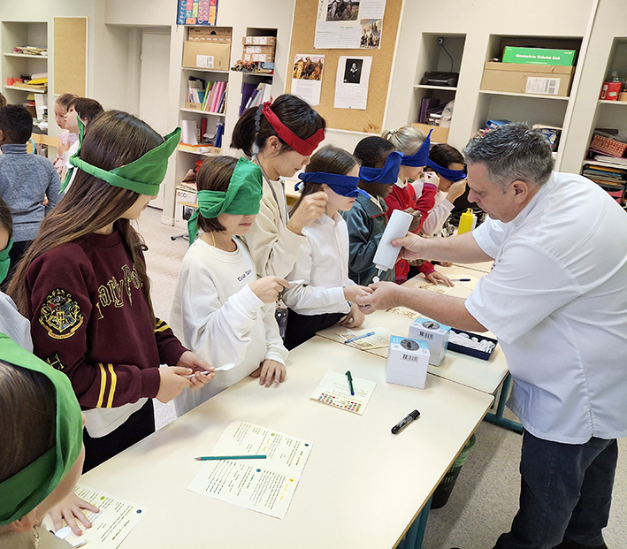 Tel un jeu de piste culinaire, le chef a guidé les élèves dans la découverte d’un ingrédient mystère, en mobilisant le toucher, l’ouïe, l’odorat et, bien sûr, le goût ! Les enfants se sont prêtés au jeu avec enthousiasme : plonger la main dans une boîte mystérieuse, goûter à l’aveugle, écouter le bruit croquant ou fondant de certains aliments… Une expérience à la fois ludique et gourmande !
