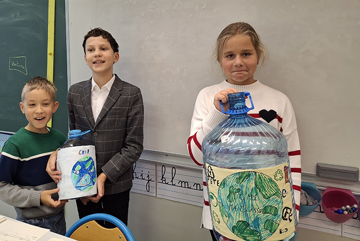 Каждая пара учеников создала рисунок, который отражает символы переработки. Эти творения были наклеены на большие пластиковые бутылки, которые затем были распределены по всем классам. Ребята также объяснили своим одноклассникам, как правильно складывать пробки.