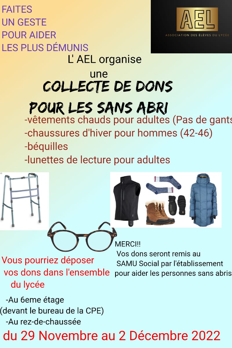 Un des projets de l’AEL de cette année scolaire est une collecte des dons pour les sans-abris. L’action va se dérouler du 29/11 au 02/12. Les dons collectés seront transmis