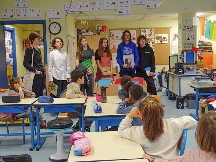 C’est avec une certaine curiosité que les élèves de CP et CE1 du site IDF ont reçu la visite de « grands » mardi 28 janvier. Il s’agissait de 5 élèves de 4e et 5e arr