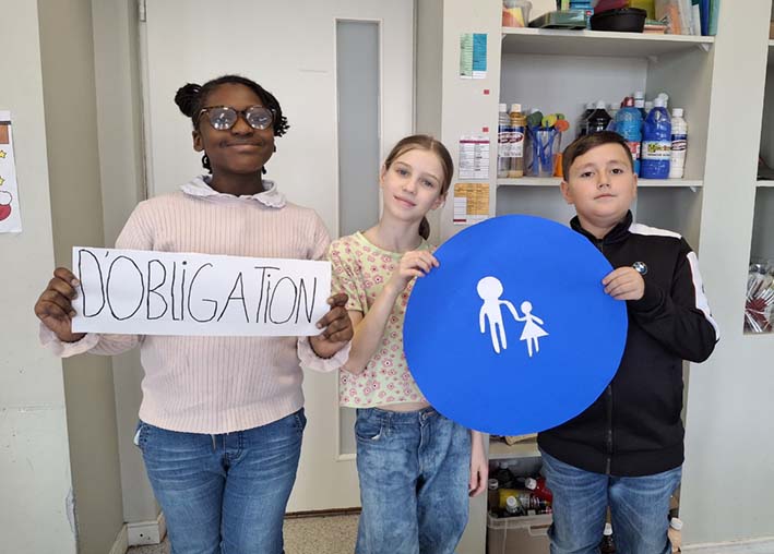 Combinant l'art visuel, la géométrie et le programme d'Éducation Morale et Civique (EMC), les CM1B ont confectionné des panneaux de signalisation « grandeur nature » en lie