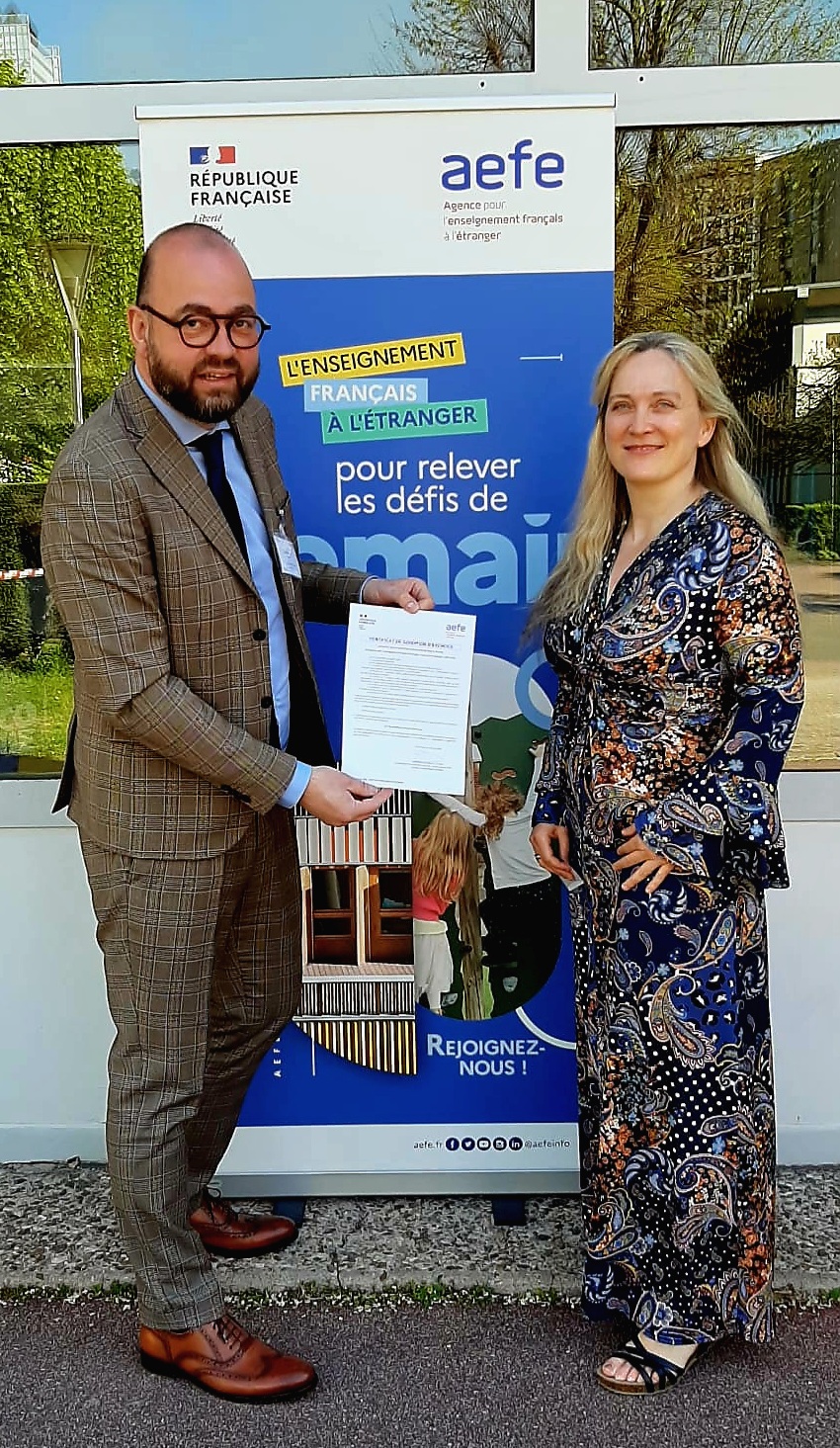 Notre Proviseur a eu la joie, ce mardi 8 avril à Paris, de se voir remettre la certification de l'établissement, par l'AEFE, pour délivrer des formations de secourisme. Voilà u