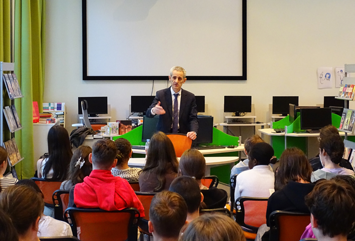 Le mardi 24 juin, les élèves de 5e ont accueilli le Ministre-Conseiller auprès de l’Ambassade de France à Moscou, Mr Zacharie Gross, pour une heure d’entretien au CDI. Le t