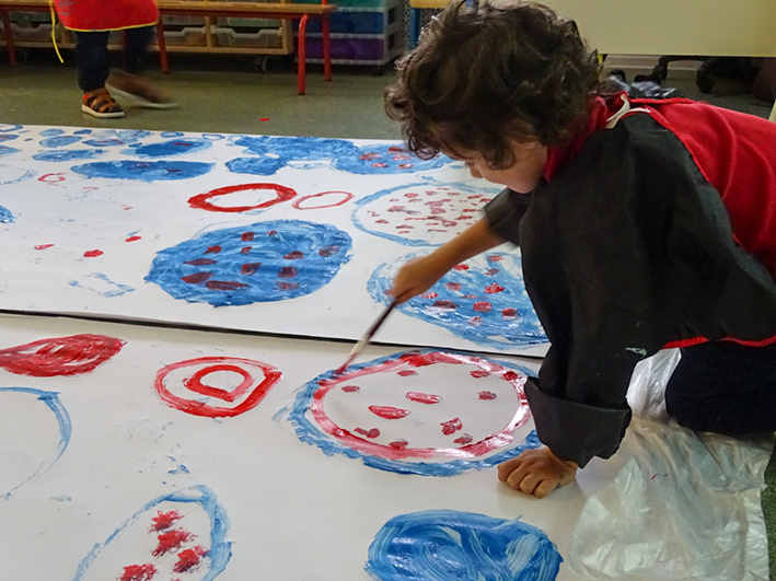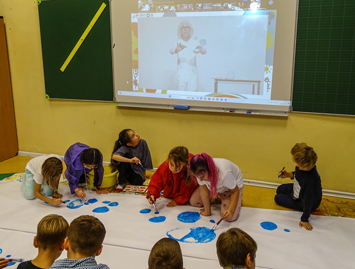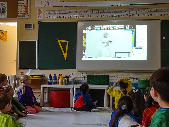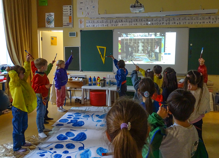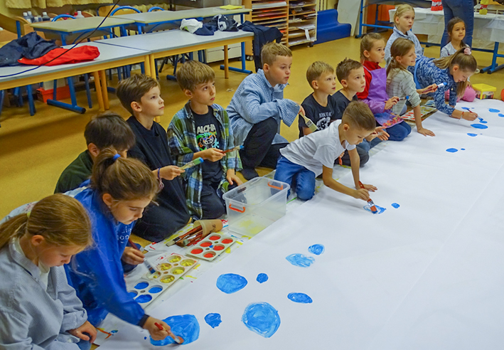Les G SA, CP A, CE2 A et CM1 A d’EIB se sont jointes à cette belle initiative pour peindre un grand et magnifique champ de fleurs. Du papier, de la gouache, des pinceaux, de l’eau et les instructions de l’artiste, tout cela accompagné de musique, voici comment était notre point de départ, les élèves étant répartis dans les 3 salles et en BCD.