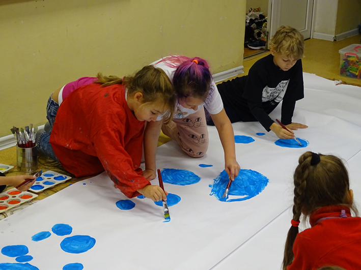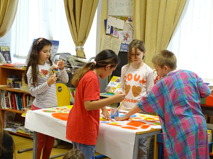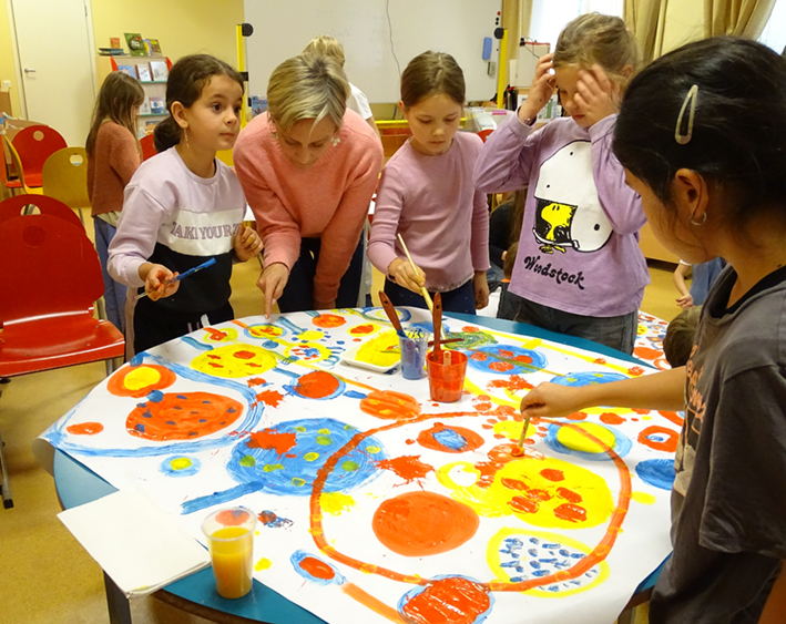 Les enfants étaient amenés à changer de place pour peaufiner leur œuvre collective et ils s’en sont donné à cœur joie pour s’exprimer librement par les couleurs ! C’était ça la réussite de ce superbe atelier.