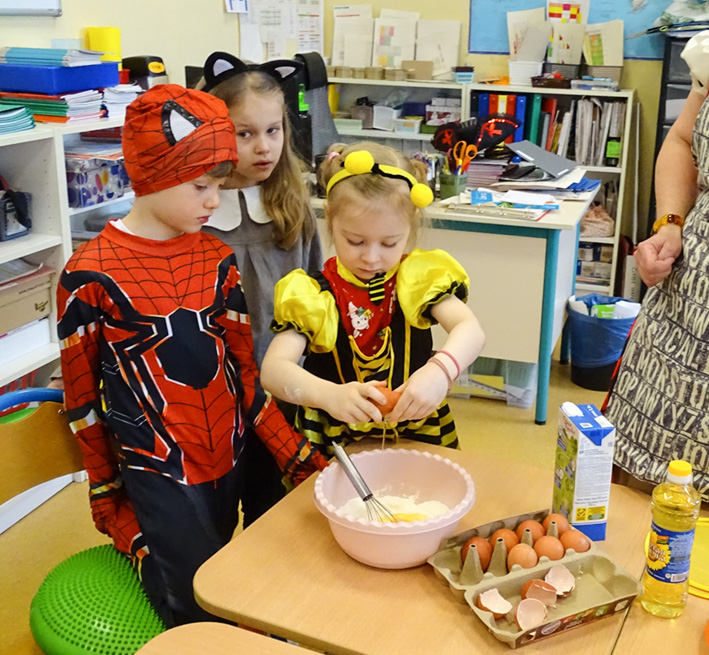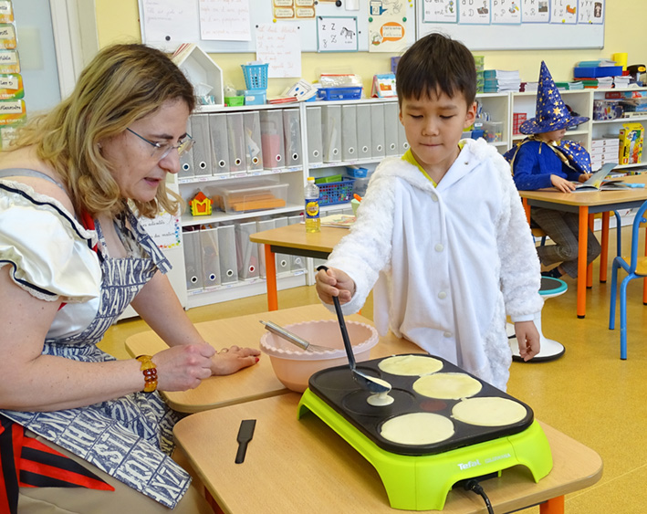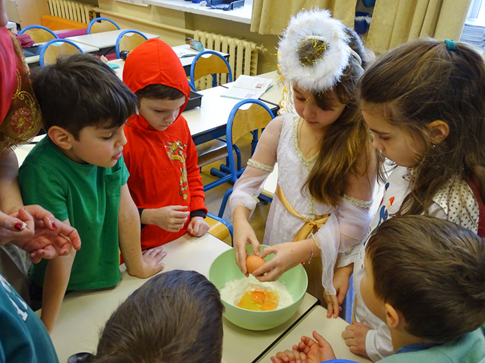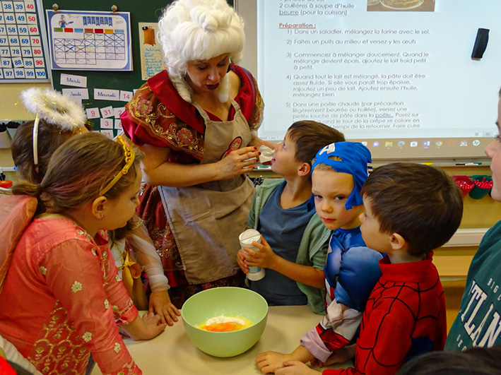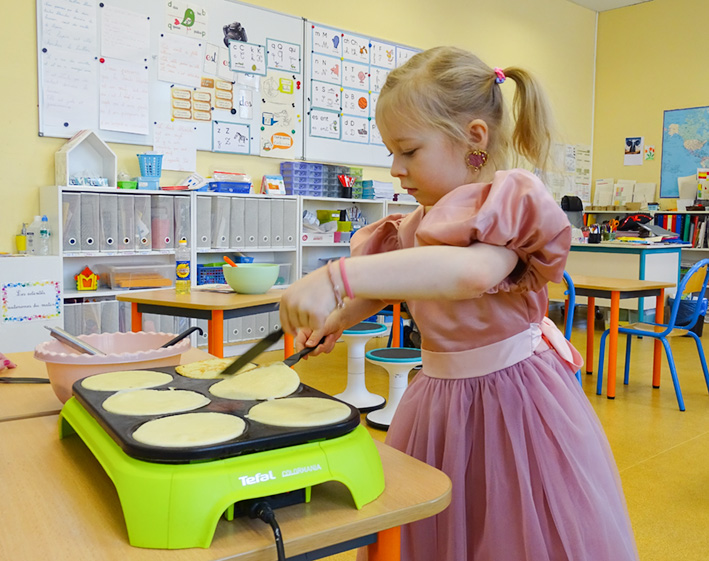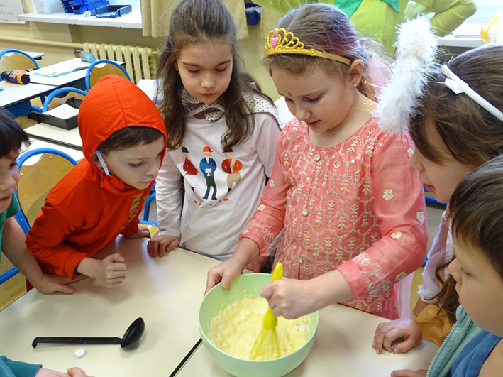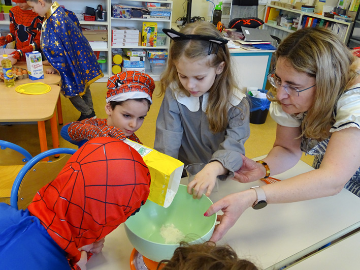 Après le défilé, les classes de CP et CE1 ont fait des crêpes. Cette tradition est adorée par les élèves : chacun participe à la préparation et puis à la dégustation.