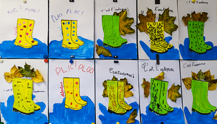 Regardez les bottes des classes de CE1 A et CP-CE1 B ! Plic, ploc – on saute dans les flaques d’eau.