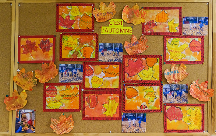 C’est un panneau fait par les élèves de CE1 : les formes géométriques étudiées en anglais et en russe se réunissent avec les motifs de l’automne :