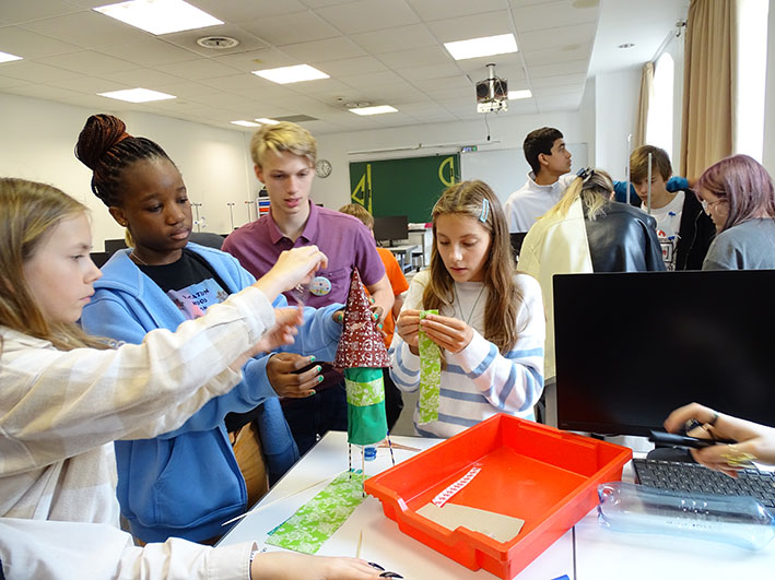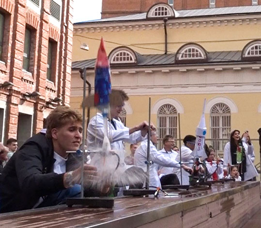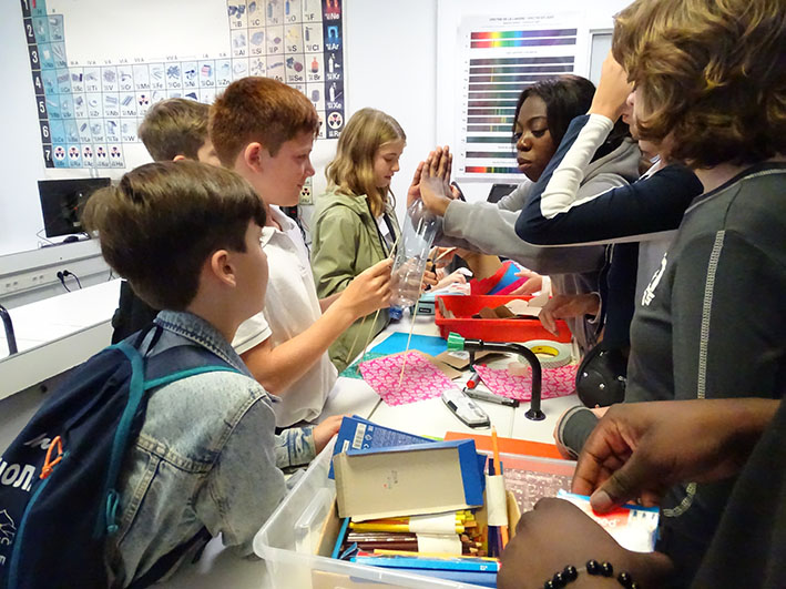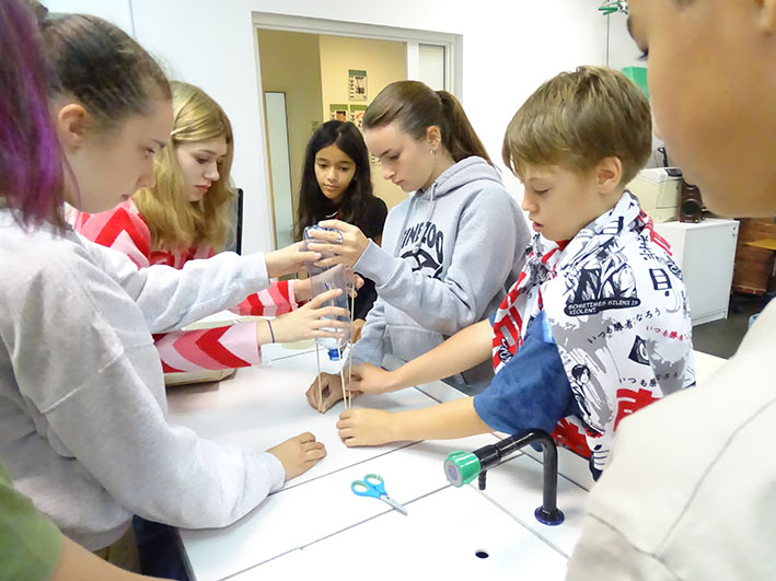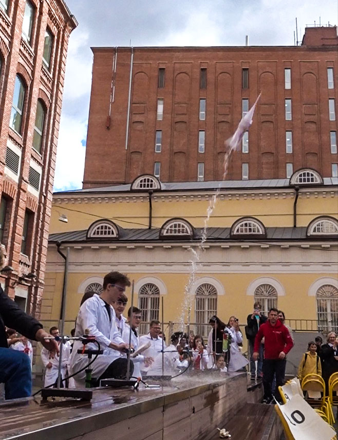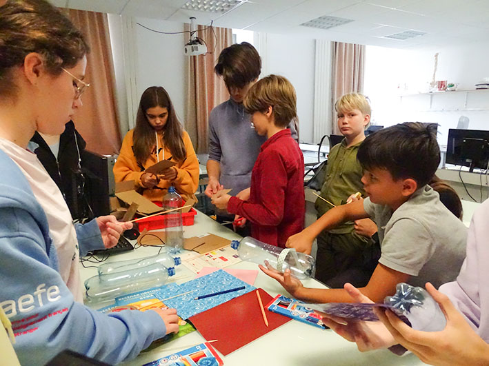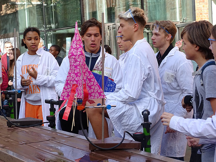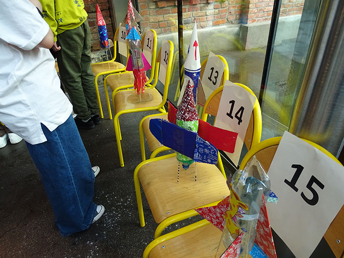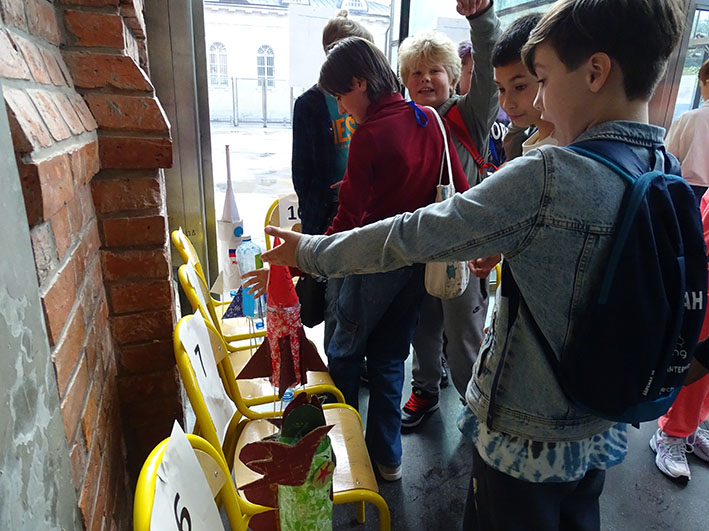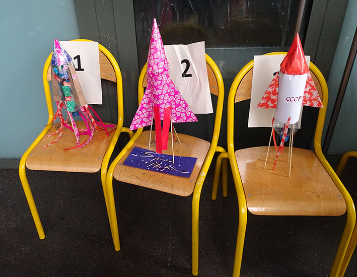 L’eau qui est éjectée de la fusée sous l’effet de la pression éjecte à son tour la fusée dans les airs, les qualités aérodynamiques des fusées sont dues aux décorations conçues par les élèves.