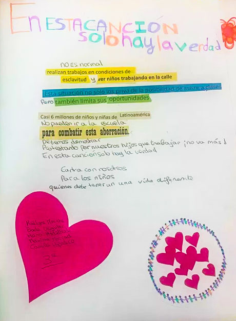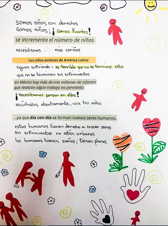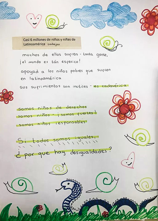 Les troisièmes ont réveillé leur créativité en s’improvisant poètes. Ils ont fait des rimes avec des morceaux de textes des différents articles sur le sujet « Les enfants de la rue ». Cette activité a été proposée dans le cadre de l’unité « Quiero realizarme » /Je veux réussir/.