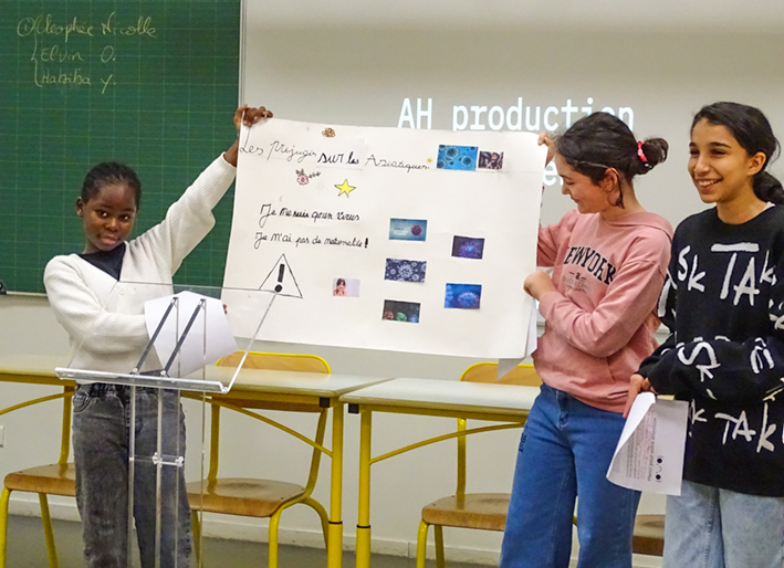 Depuis deux mois, encadrés par les professeurs Mme Bonnaud et M. Iannucci nos candidats ont travaillé en groupes et réfléchi sur les préjugés. L’objectif est de leur faire comprendre que les idées reçues peuvent entrainer des inégalités. Il a été proposé aux participants d’élaborer des travaux sous forme d’affiche et de courte vidéo.