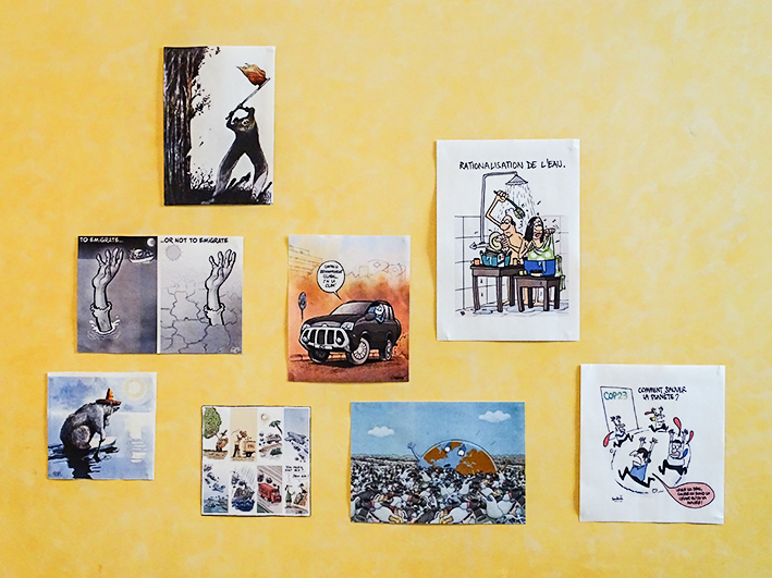 Un travail plus approfondi sur le dessin de presse sera fait jusqu’aux prochaines vacances à partir d’une exposition de l’association Cartooning for peace sur le front de l’écologie. Une dizaine de dessins sont affichés au CDI.