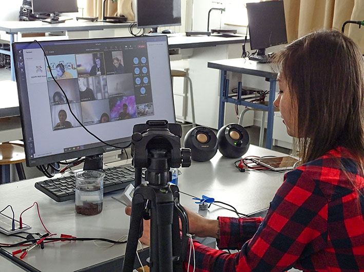 En 4ème B par exemple, les élèves réalisent des petites expériences à la maison comme la fabrication d’une pile électrique avec des pièces de monnaie et complètent le travail par des manipulations interactives en visioconférence depuis les salles de classes.