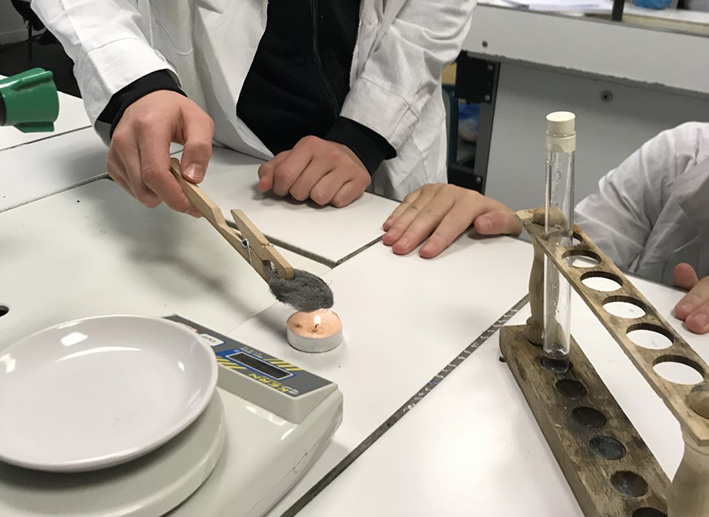 D’abord les élèves devaient mesurer la masse d’une bûchette de charbon. Ils devaient ensuite la faire brûler au-dessus d’un tube à essais avec l’eau de chaux pendant 20 secondes et enfin au-dessus d’une bougie pendant 2 minutes. Après tout cela il fallait mesurer la masse de nouveau et elle diminuait.