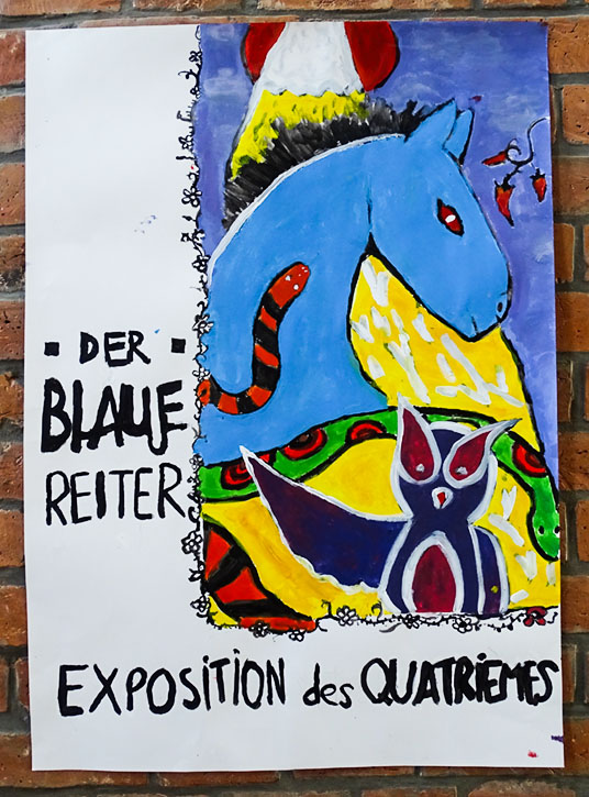 Lors des cours d’Arts plastiques, les 4èmes ont travaillé sur le thème de Kandinsky et des mouvements artistiques de son époque. L’histoire du cercle « Der Blaue Reiter » et de leurs productions ont inspiré les élèves à proposer leur interprétation de ce personnage symbolique.