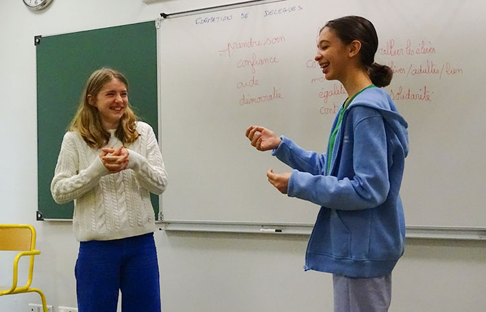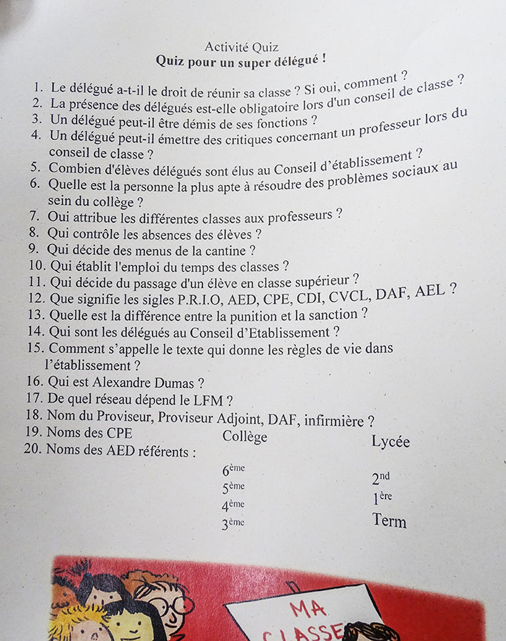 Les délégués de la 6ème à la 3ème – ont été réunis pour mieux se connaître, pour définir le rôle de délégué, découvrir en détail le fonctionnement de notre établissement, son organigramme, son appartenance au réseau AEFE. Le programme de la séance était très dense et intéressant.