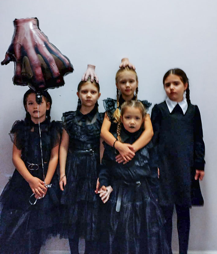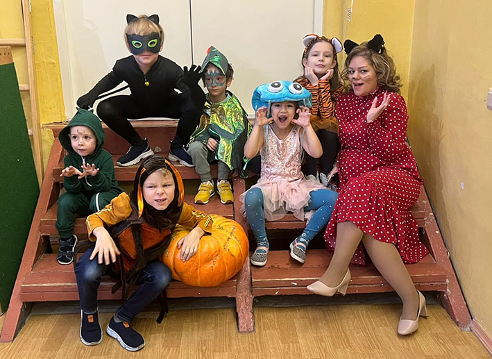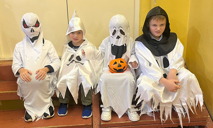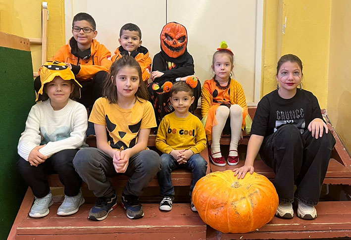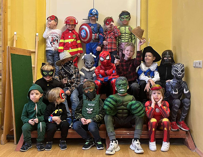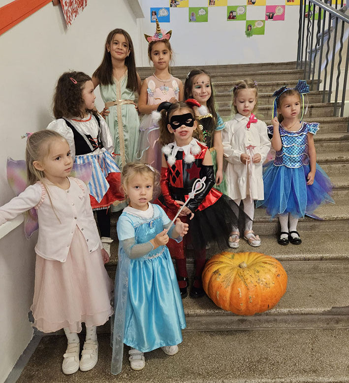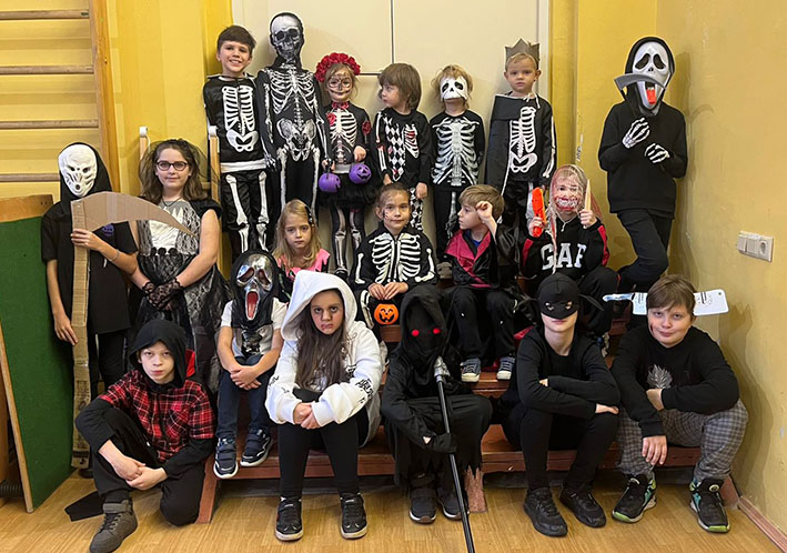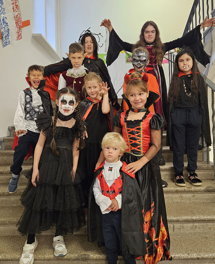Nous nous sommes tous réunis dans le gymnase pour des photos thématiques dans la joie et la bonne humeur. Ensuite, les enfants bien déguisés ont malgré tout très bien travaillé !