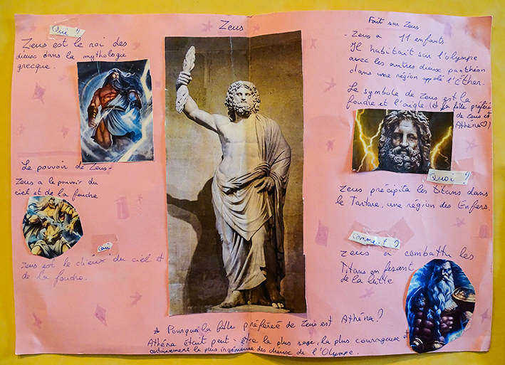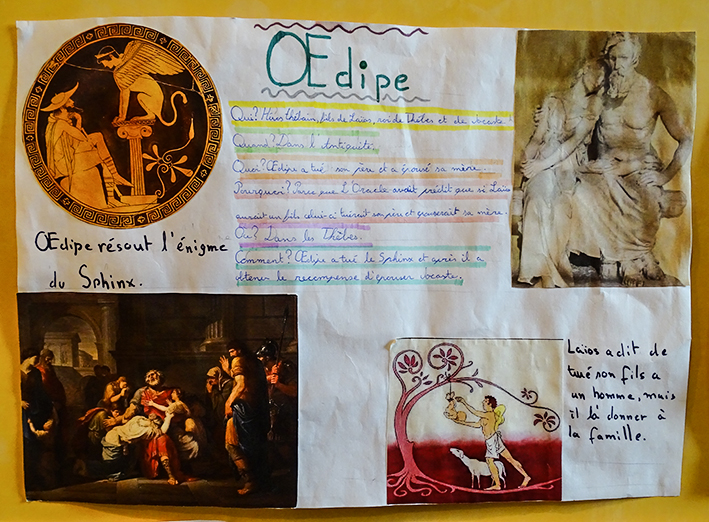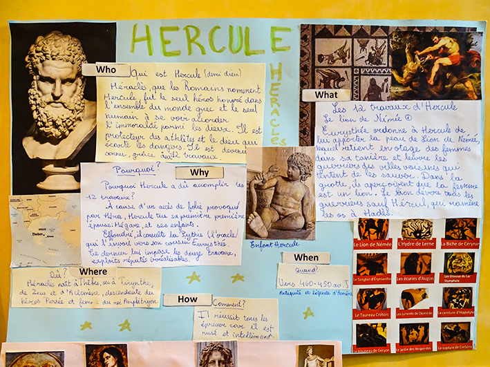 Les élèves de 6e exposent en ce moment au CDI leurs affiches sur le thème de la mythologie. Il s’agit d’un travail réalisé dans le cadre de leur cours d’Education aux médias et à l’information. La première partie de l’année est consacrée à la méthodologie de la recherche documentaire.