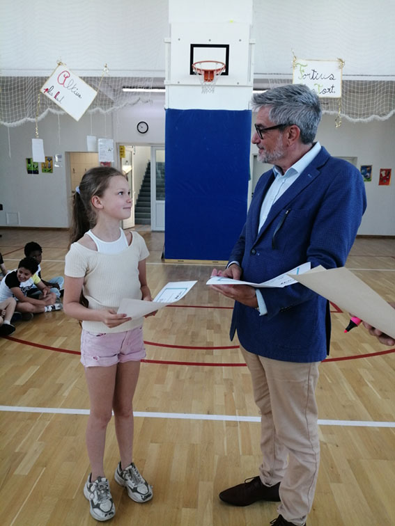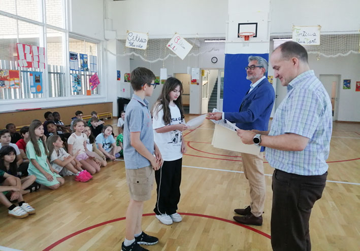 La remise des diplômes du concours « La course aux nombres », proposée par l'académie de Strasbourg et relayée par Mr Yves Banzet, professeur de mathématiques au lycée et par Mme Delanoy, Mme Carpuat et Mr Riss, enseignants à l'IDF, a eu lieu la semaine dernière pour toutes les classes du cycle 3.
