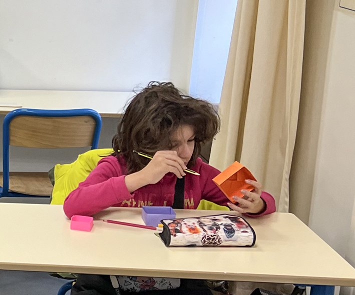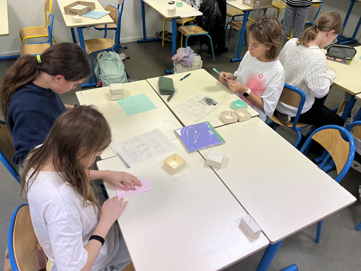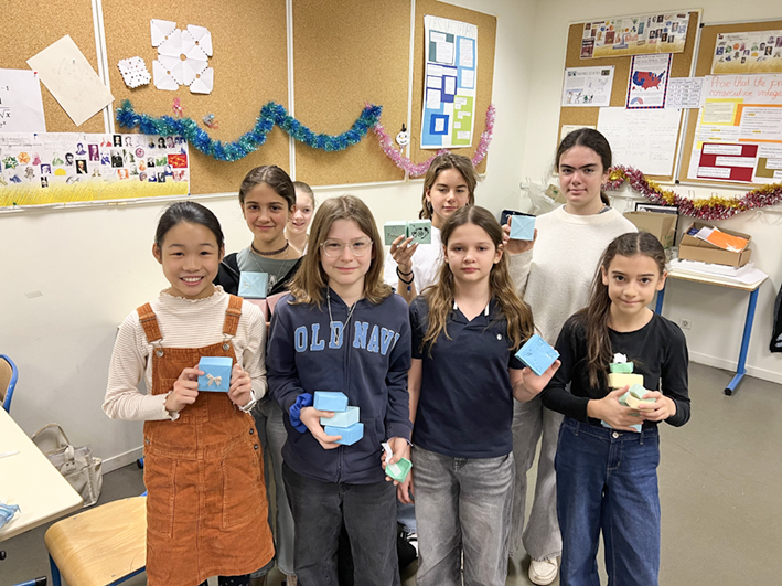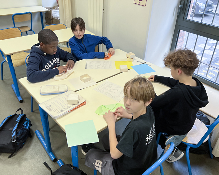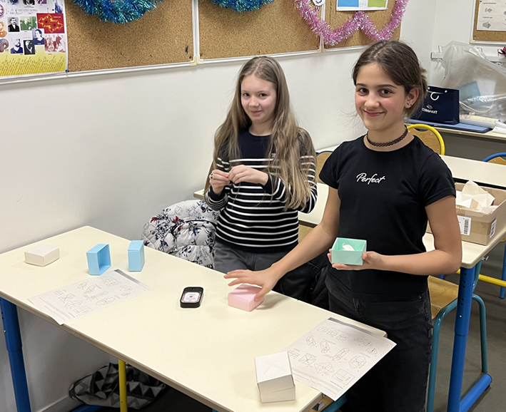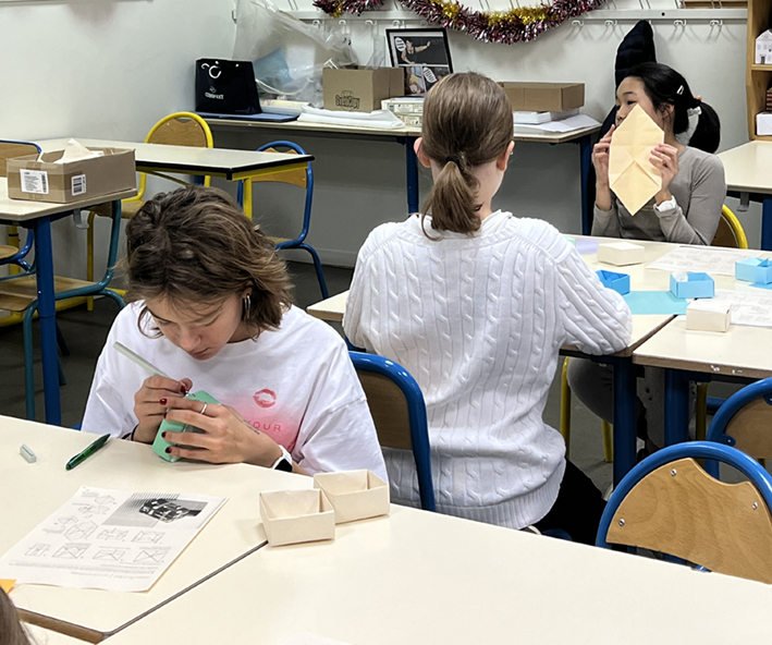 Chaque élève a confectionné une boîte en origami qu’il offrira à un ami ou à un proche. Au-delà de l’aspect technique et mathématique, cette activité met en avant l’importance du geste : offrir un objet que l’on a pris le temps de concevoir et de réaliser soi-même. Chaque boîte reflète ainsi une part de la personnalité et de l’originalité de son créateur, rendant le cadeau unique et chargé d’émotion.