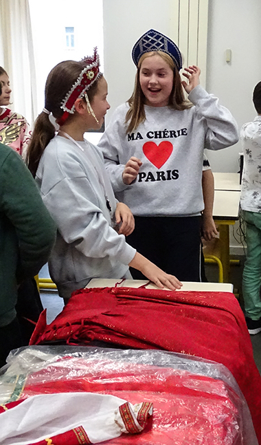 La répartition des rôles a été déjà faite, les textes ont été appris par cœur. Maintenant c’est le tour des costumes : des robes et des chemises dans le style traditionnel, des couronnes et des ailes, des coiffes et des queues… quel choix !