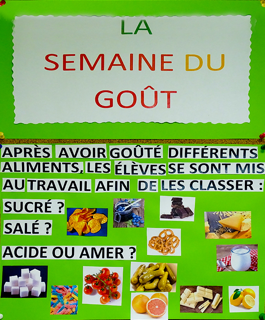 Cette semaine nous avons goûté différents produits alimentaires, puis les élèves les ont classés par catégorie : sucré, salé, amer ou acide ?