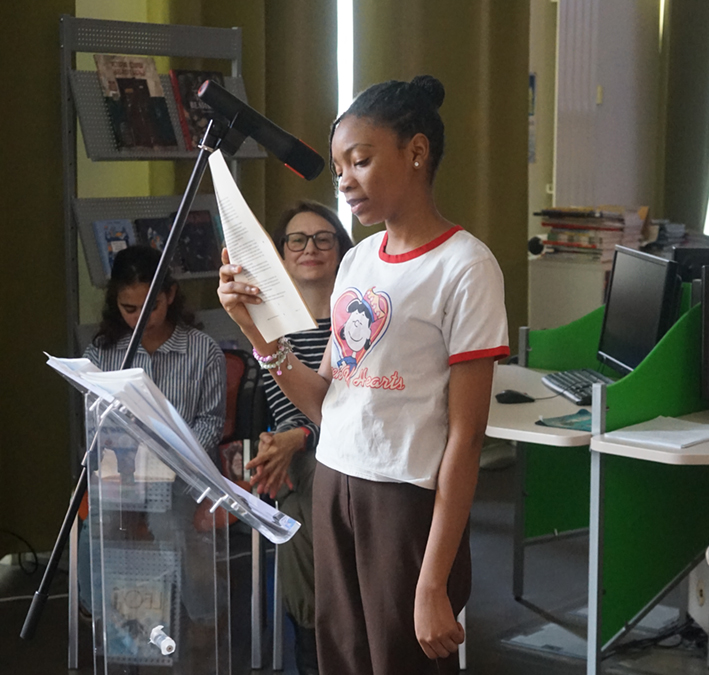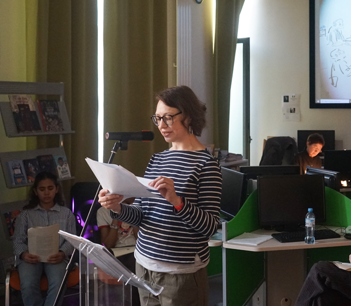 Tout d'abord, la traductrice de l'ouvrage, Irina Filippova, en russe, puis les élèves de 5e Sofia, Kayla, Cléophée, Daria et leur professeure documentaliste Mme Bonnaud, en français.