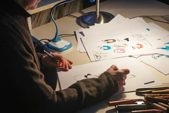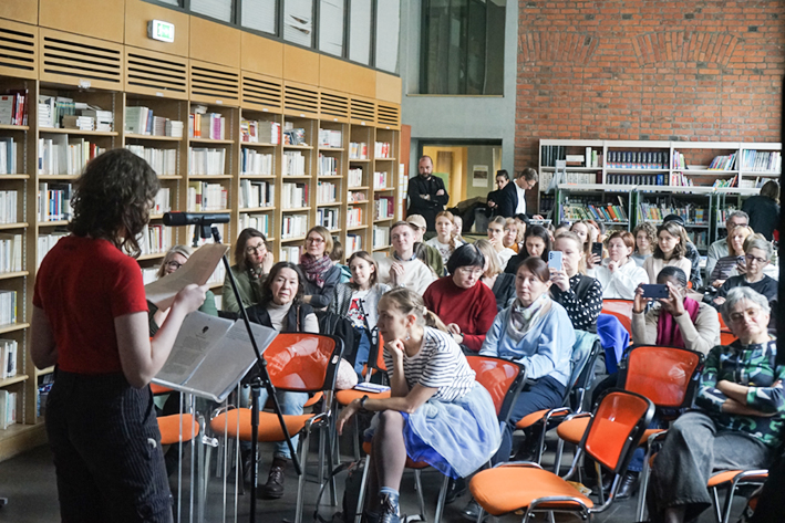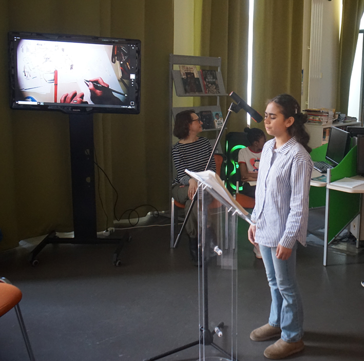 En même temps, l'illustratrice de la version russe du livre, Evgenia Dvoskina, dessinait des scènes des morceaux lus, dessins projetés en direct sur le grand écran du CDI.