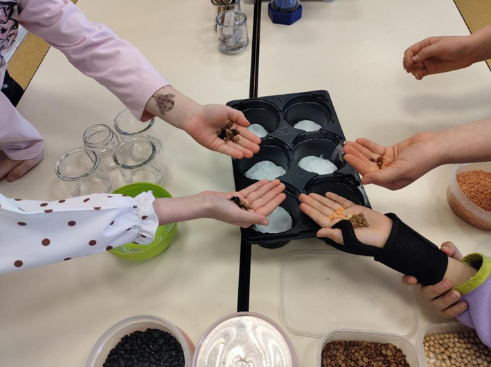 Après avoir creusé des trous bien espacés, chaque enfant a déposé doucement ses graines dans la terre humide. Cette étape était accompagnée d'instructions simples mais efficaces en français, telles que « Prends ta graine », « Fais attention où tu mets tes doigts ».