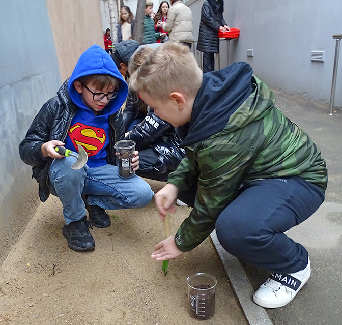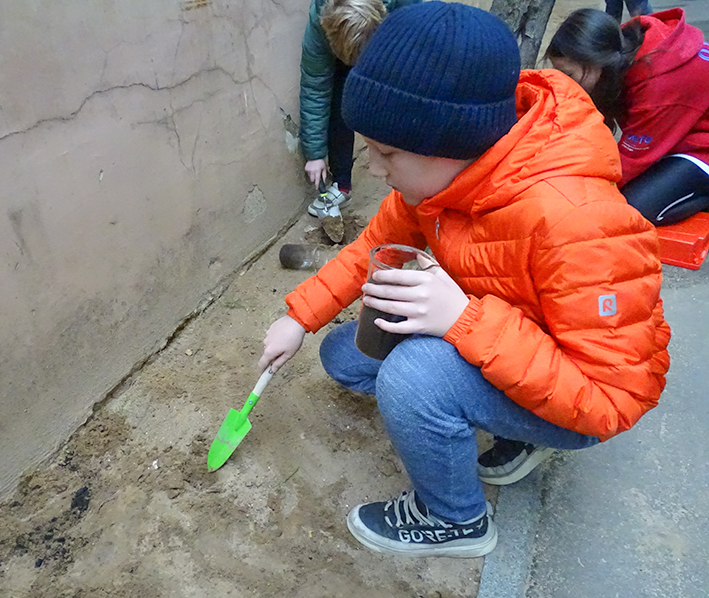 Equipés de pelles, les élèves ont creusé la terre à côté d’un mur pour y mettre de l’humus et des bulbes de tulipes.