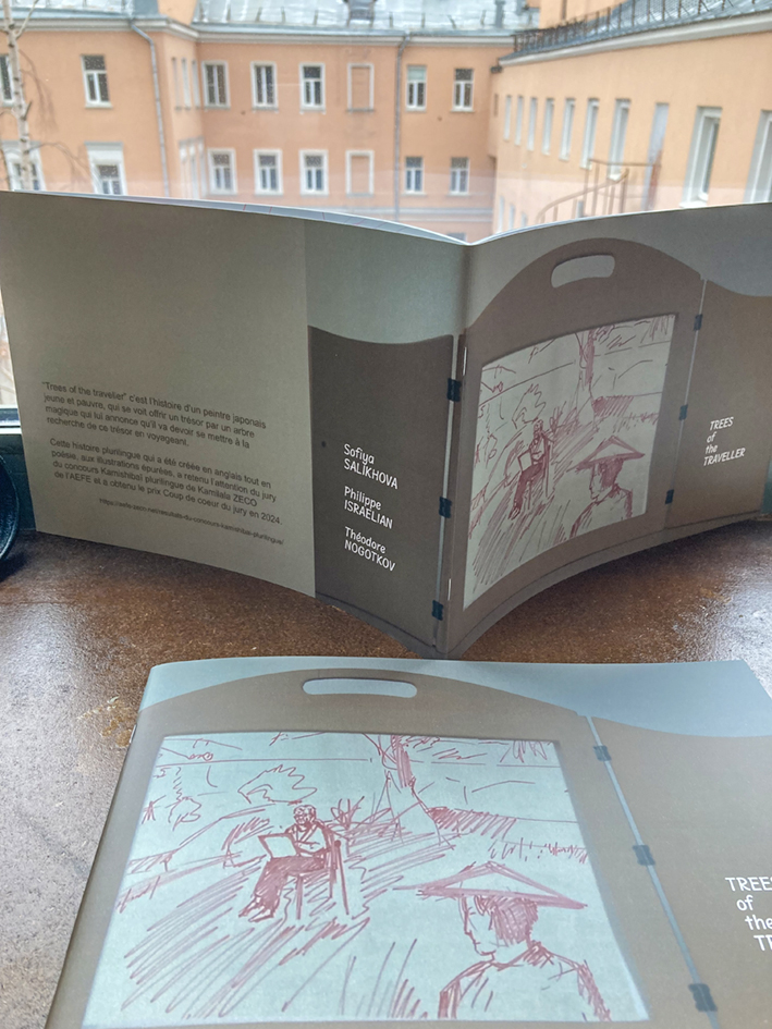 Le 20 février, le Proviseur du LFM M. Schütz a remis aux auteurs les exemplaires du livre Trees of the Traveller, consacré au projet pour le concours des théâtres en papier japonais Kamishibaï plurilingue organisé par Kamilala ZECO de l’AEFE.