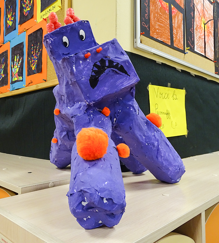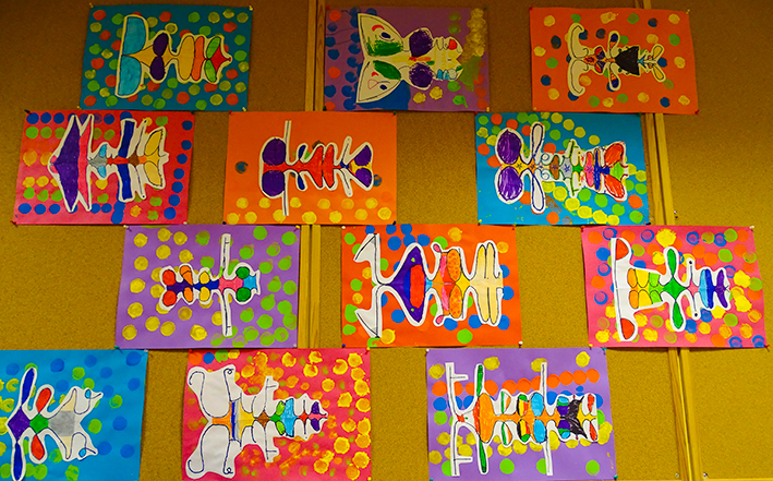 Каждый ученик выбрал слог, чтобы придумать имена воображаемым существам, которые теперь украшают коридор: