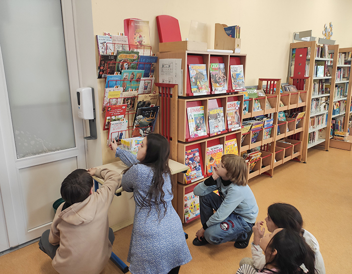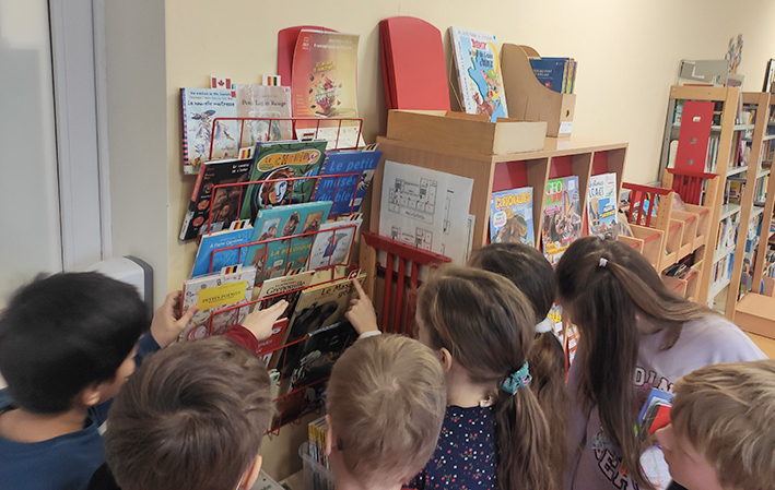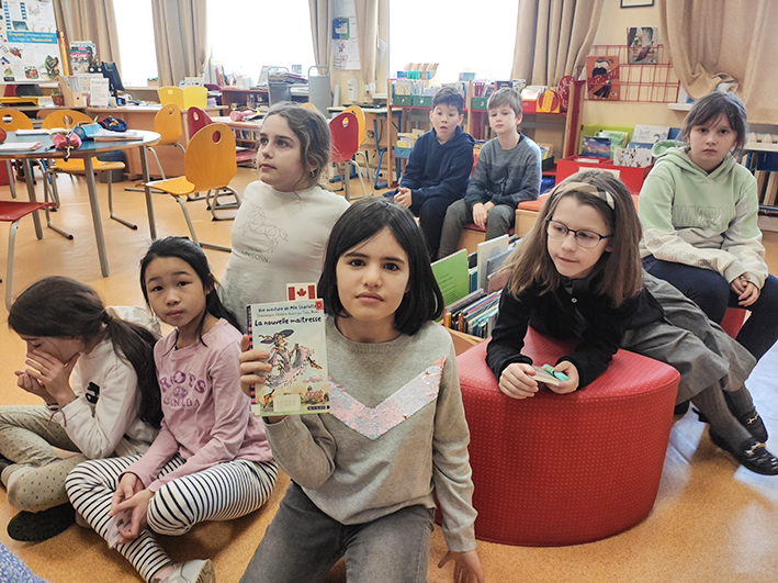 Рассматривая выставленные книги, CM1 пытались определить страну происхождения авторов, используя бумажный флажок, прикрепленный к обложке. С большой радостью они узнавали некоторых из них, таких как Эрже или Марио Рамос (оба бельгийцы). Инес (CM1 A) рассказала нам о книге из серии Une aventure de Mlle Charlotte, которую она брала почитать, автором которой является Доминика Демерс, канадка из Монреаля. Что касается Мориса Карема, бельгийского поэта, его стихотворения включены в программу, и почти все СМ утверждают, что знают его. А вот для CE1 это было открытием, и они почитали стихи вслух.