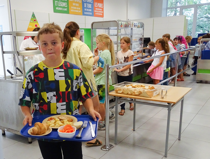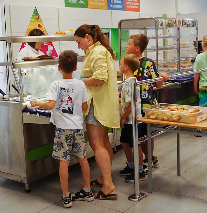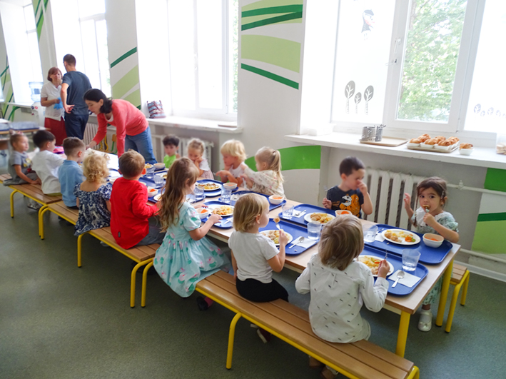 Самые первые посетители столовой – младшая группа Матернель. Для малышей накрыт отдельный стол, еду приносят взрослые.