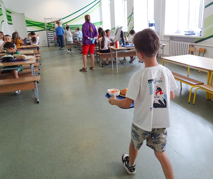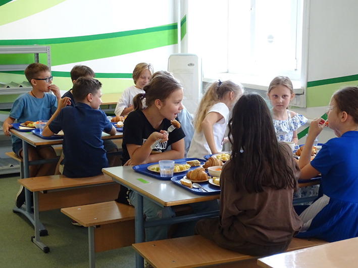 Пора обедать! И мы отправляемся в столовую школы им. Бунина. Все готово к приходу ребят: салаты, суп, горячее, гарнир, молочный продукт и, главное, десерт – все выглядит очень аппетитно!