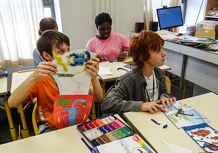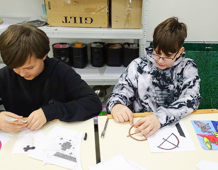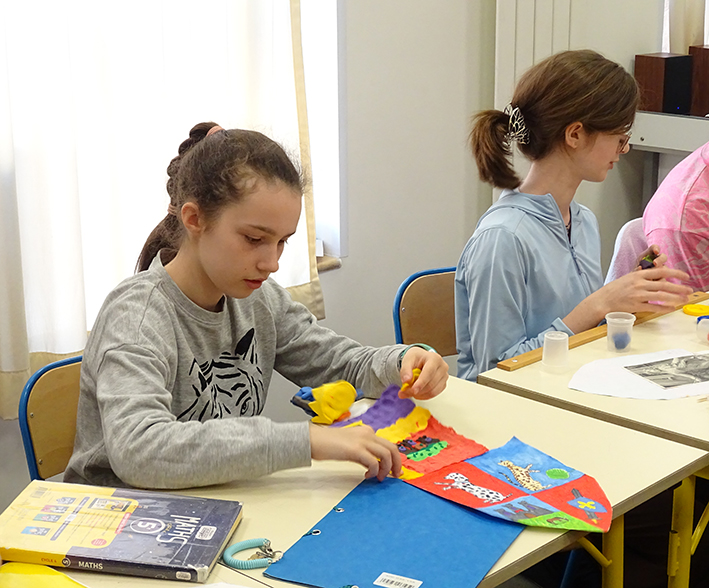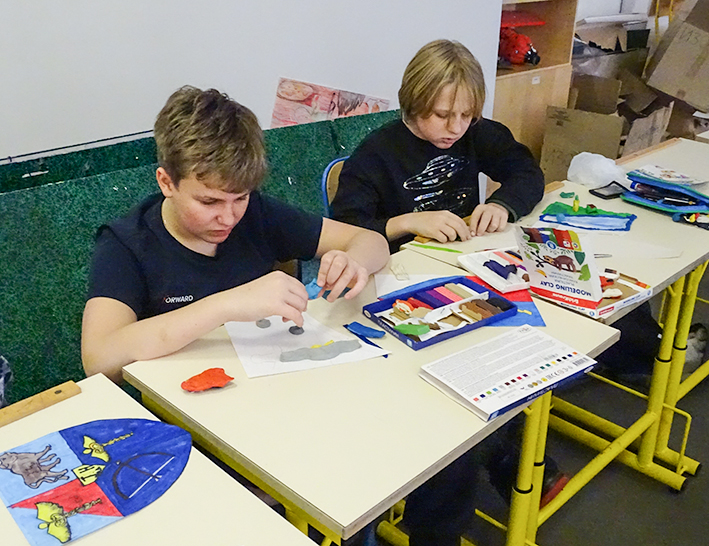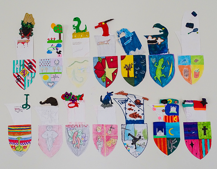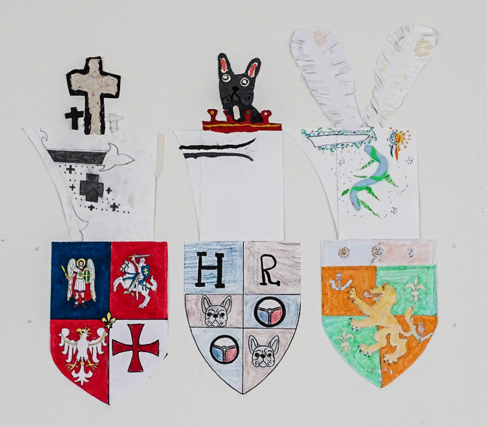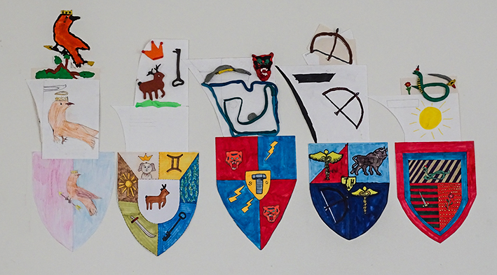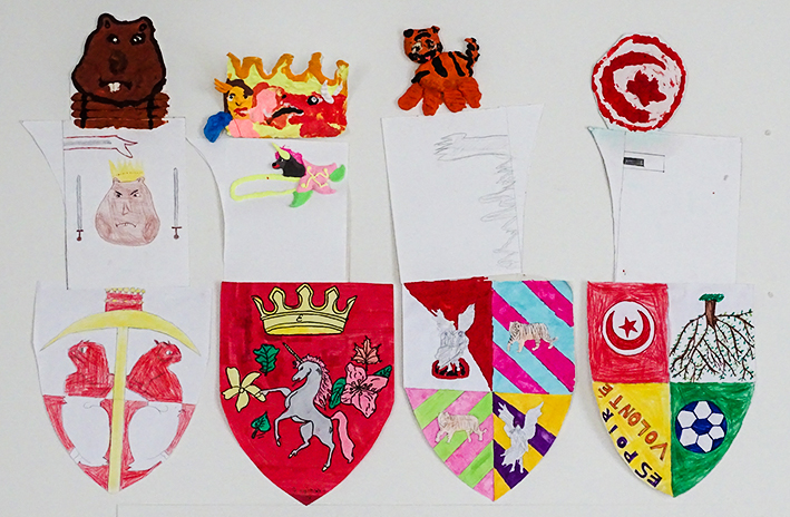 На уроках изобразительного искусства под руководством господина Гийома ШЕВАЛЬЕ, преподавателя, наши ученики изучили основные принципы создания гербов, восходящие к Средневековью. Строго регламентированный, рисунок символов связан с этимологией фамилий, с названием страны происхождения, с профессией или увлечениями владельца и т.д., и наши ученики черпали в этом вдохновение. Речь шла не только о рисовании щита, но и о моделировании главного символа, который должен венчать герб.