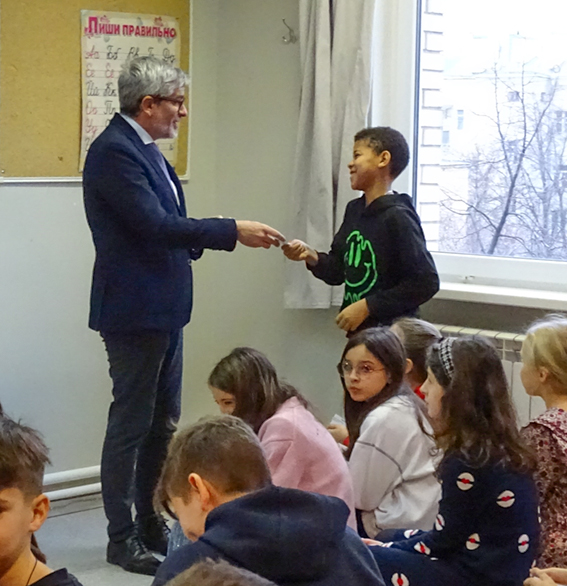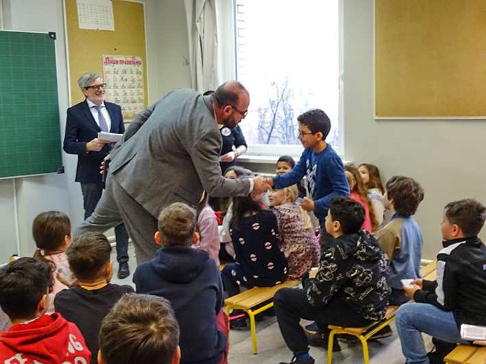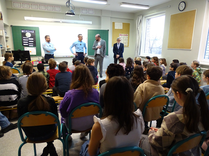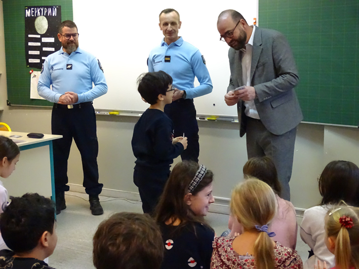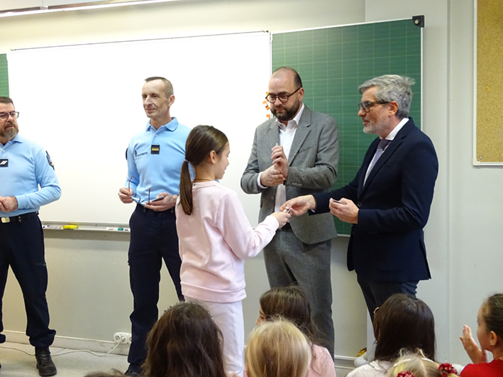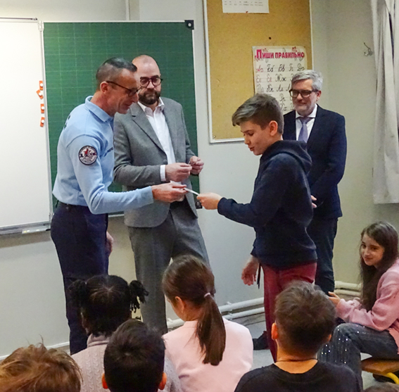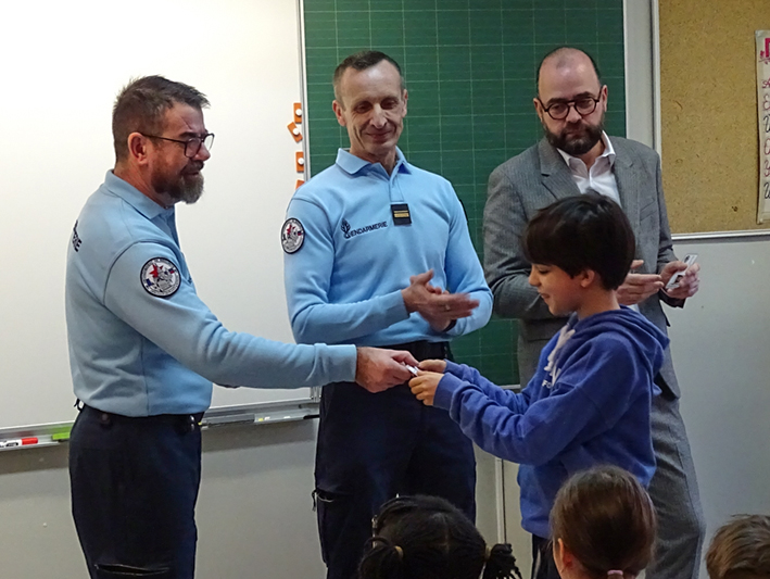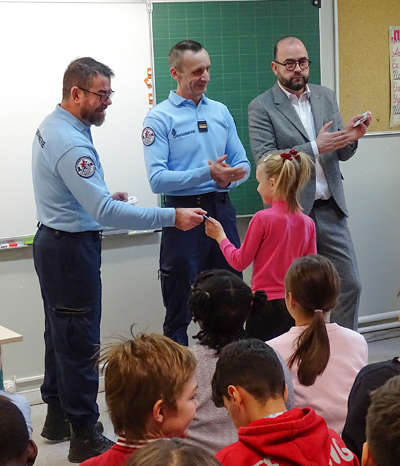 В четверг, 6 февраля, на церемонию вручения «Прав пешехода» собрались все три класса. Директор лицея, Директор начальной школы, майор Генге и жандарм Фруктар вручили ученикам именные права, пожелав им всегда быть внимательными на дороге.