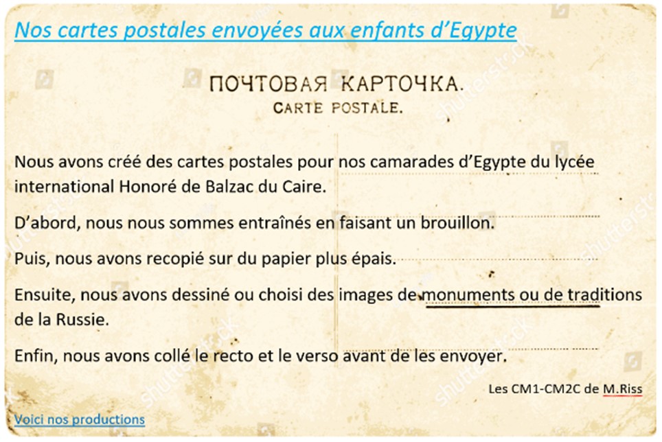 Учащиеся класса CM1-CM2C сделали новогодние открытки для ребят из Международного лицея им. Оноре де Бальзака в Каире и отправили их в Египет.