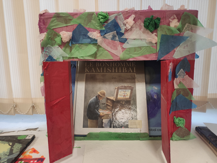На другом занятии дети окунулись в историю этого удивительного жанра. Благодаря чтению иллюстрированной книги Аллена Сэя « Le bonhomme kamishibaï » мы очутились в Японии, где пожилой человек вспоминает свою юность, когда он был рассказчиком камисибай в то время, когда еще не было телевидения. Он решает снова дарить свое мастерство, убежденный в том, что люди все еще нуждаются в его искусстве рассказчика, великолепных рисунках на бумаге и красоте человеческого общения. Мы с ним согласны.