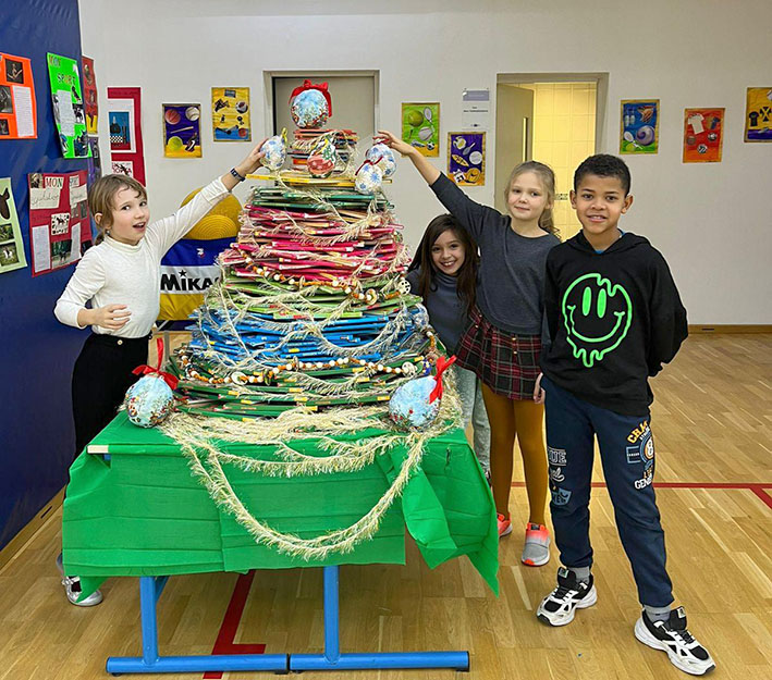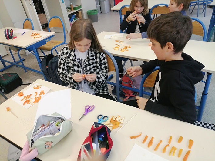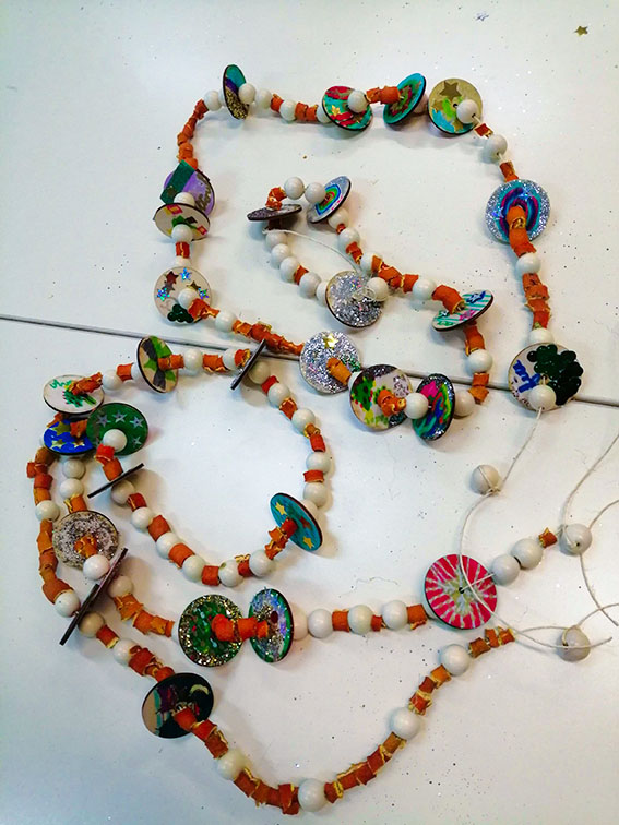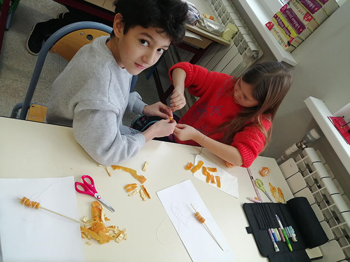 В рамках проекта «ADN demain durable», направленного на развитие экологического мышления, учащиеся класса CM1B школы IDF изготовили новогодние гирлянды из экологичных материалов – высушенных корок мандарина и дерева.