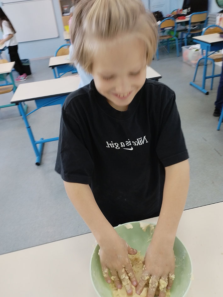 в то время как другая группа готовила тесто (мы взвешивали, резали и смешивали руками).