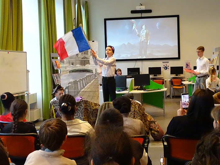 В пятницу 10 апреля наш лицей в очередной раз посетил Французский Альянс. На этот раз из города Нижний Новгород к нам приехала труппа юных актёров и показала на французском языке свой спектакль на тему истории Франции. Мы увидели баррикады Парижской Коммуны, Александра Дюма, прогуливавшегося в лютый мороз по улицам Санкт-Петербурга, услышали прекрасные стихи Шарля Бодлера и Виктора Гюго, аплодировали танцу в ритме йейе.