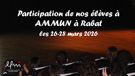AMMUN — это модель Организации Объединённых Наций, которая проводится в Рабате Французским международным лицеем имени Андре Мальро. Каждый ученик защищает позицию закреплённой за ним страны по заданной теме, с конечной целью достичь компромисса с другими делегациями и разработать резолюцию. По итогам мероприятия вручаются награды ученикам, которые лучше всего отстояли позицию своей страны. В этом году учащиеся Французского лицея в Москве проявили себя особенно ярко: Фарида получила почётное упоминание, а Иван был избран лучшим делегатом комитета ECOSOC.