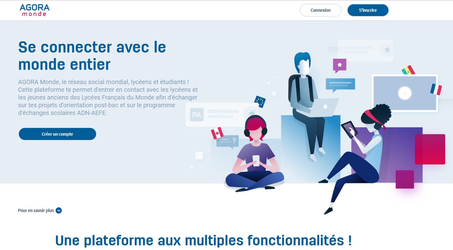* AGORA Monde, le réseau social mondial, permet d'entrer en contact avec les lycéens et les jeunes anciens des Lycées Français du Monde afin d'échanger sur des projets d'orientation postbac et sur le programme d'échanges scolaires ADN-AEFE. Sur la plateforme AGORA Monde, on trouve de nombreux outils pour accompagner les élèves dans la construction de leur parcours d'orientation. Un annuaire des lycéens et des jeunes anciens du réseau AEFE, un forum sur l'orientation, des vidéos et des témoignages sont à disposition pour que les élèves bénéficient des conseils de ceux qui étudient actuellement dans les secteurs ou les formations qui les intéressent.