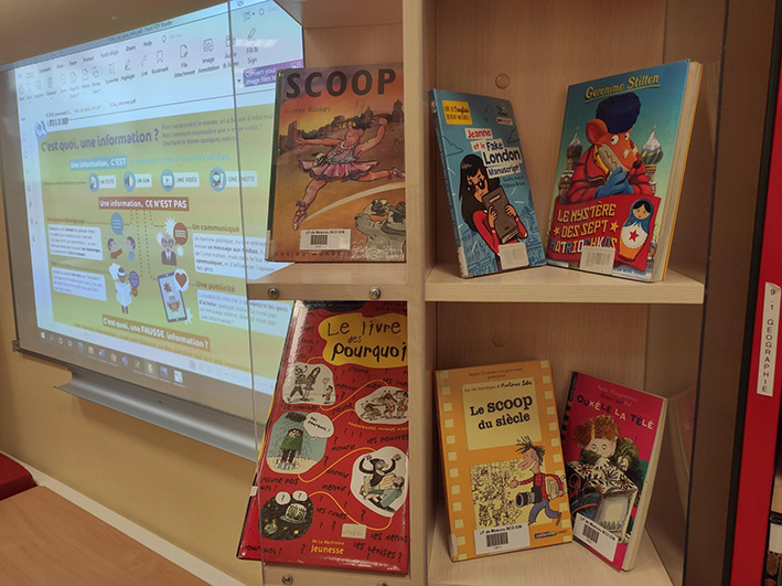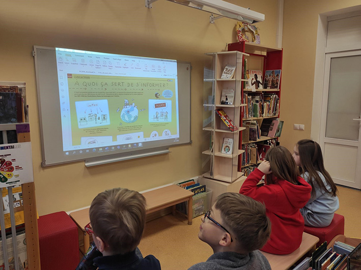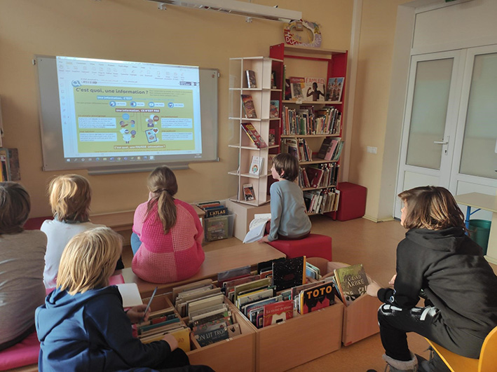 Quant aux élèves du cycle 3, les CM1 et les CM2 ont cherché des réponses à trois questions énigmatiques : C’est quoi les médias ? C’est quoi une information ? et A quoi ça sert de s’informer ? Et ce, en lisant des articles papier et en ligne tirés de l’hebdomadaire à destination des jeunes élèves de 8 à 12 ans 1jour1actu édité chez Milan Jeunesse. « Chaque semaine, l'actualité à hauteur d'enfants”, tel est le slogan de ce périodique dont la BCD a un abonnement, 40 numéros par an ! Un journal papier illustré, un site web, des podcasts, des vidéos, voici toutes les clés pour décoder l’information et décrypter l’actualité internationale et nationale de la semaine! Et, surprise ! l’actualité est partout, non seulement dans le journal qui est en fait un média, mais aussi à la télé, à la radio, sur le Web. C’est donc tout ça les médias ? Oui, bonne réponse ! Quel travail formidable assurent les journalistes français ! Enchantés par cette découverte, les élèves du cycle 3 sont fin prêts à accueillir prochainement à l’école Sylvain Tronchet, un journaliste à la Radio France, qui leur parlera de son métier, présentera ses outils de travail et répondra aux questions.
