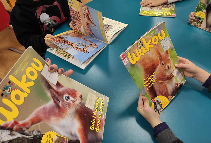Les CP et les CE1 ont appris à lire la couverture de Wakou, chacun ayant son exemplaire dans les mains pour observer le titre, le thème du grand dossier, le choix des images et le rendu des couleurs.