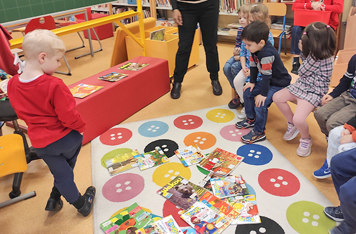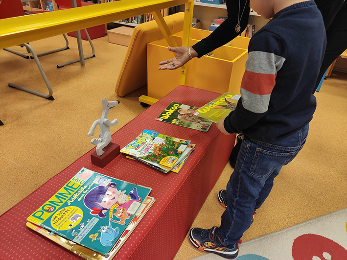 Et c’est en compagnie de Loulou et de Petrouchka, les deux mascottes de la BCD des maternelles, que les élèves se sont amusés à trier les magazines par titre en verbalisant leurs gestes.