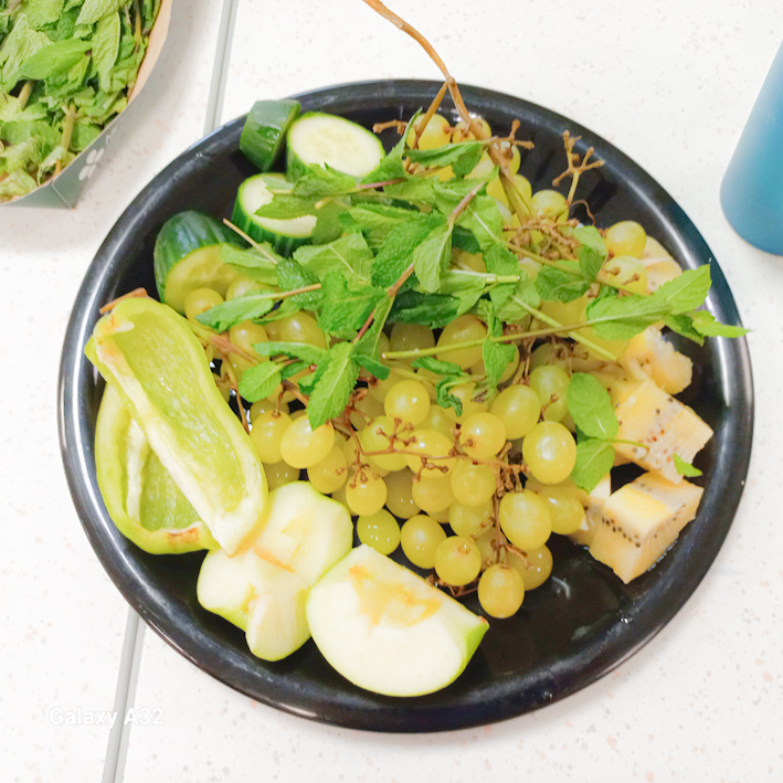 Mardi, en vert, concombres, kiwis, chips d'algues et raisins. Et découverte du jeu des fruits et des légumes et de leurs couleurs. Travail sur le vocabulaire et les règles du jeu.