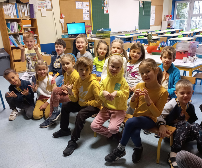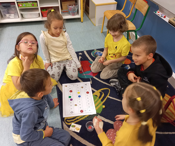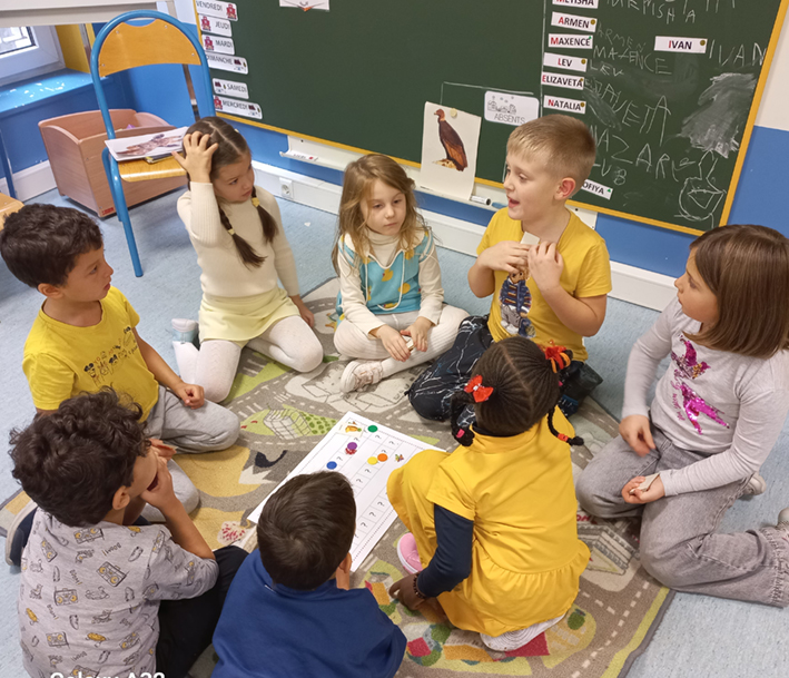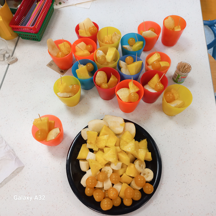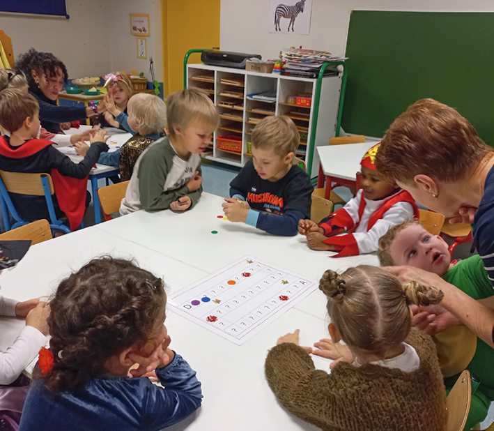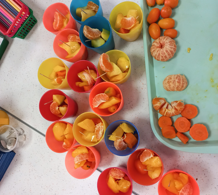 Mercredi, en jaune, ananas, tomates, citrons et bananes. Jeu avec les GS d'Anna. Les CP B étaient les maitres du jeu et responsables de petits groupes de GS. Tout le monde était actif. Et pour finir, les GS ont offert des devinettes et de drôles de gâteaux délicieux.