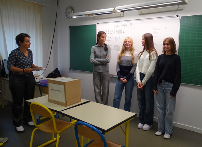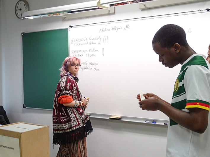 Accompagnée de son professeur principal, chaque classe à son tour procède aux élections de ses porte-paroles. Mme Rey, la CPE rappelle aux élèves les fonctions des délégués de classe et la procédure des élections.